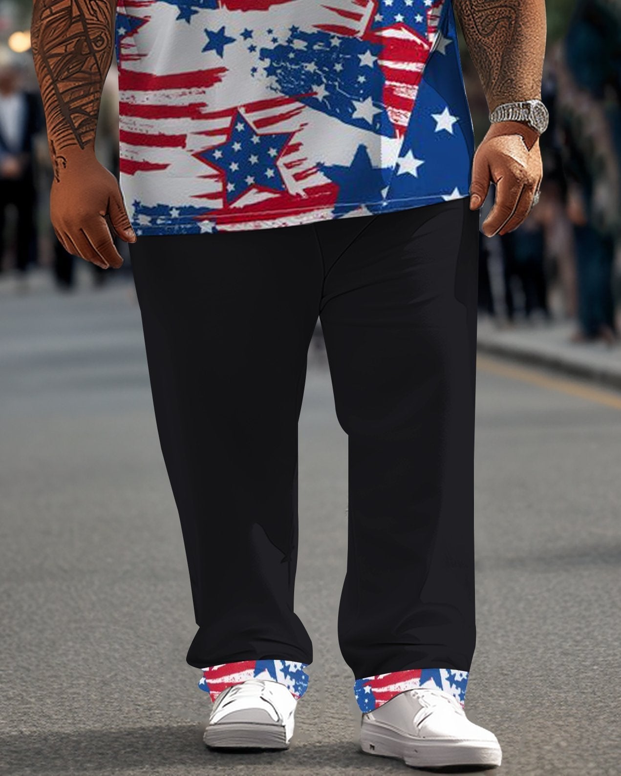 Men's large size street Independence Day short-sleeved T-shirt and trousers suit is suitable for Independence Day celebrations, street casual or parties and other occasions. This combination can show off one's fashion sense and love for Independence Day. Remember to choose the size and style that suits you to ensure the comfort and effect of the garment. According to personal preferences and the needs of the occasion, you can adjust the matching details appropriately to create a street style that suits your own style.