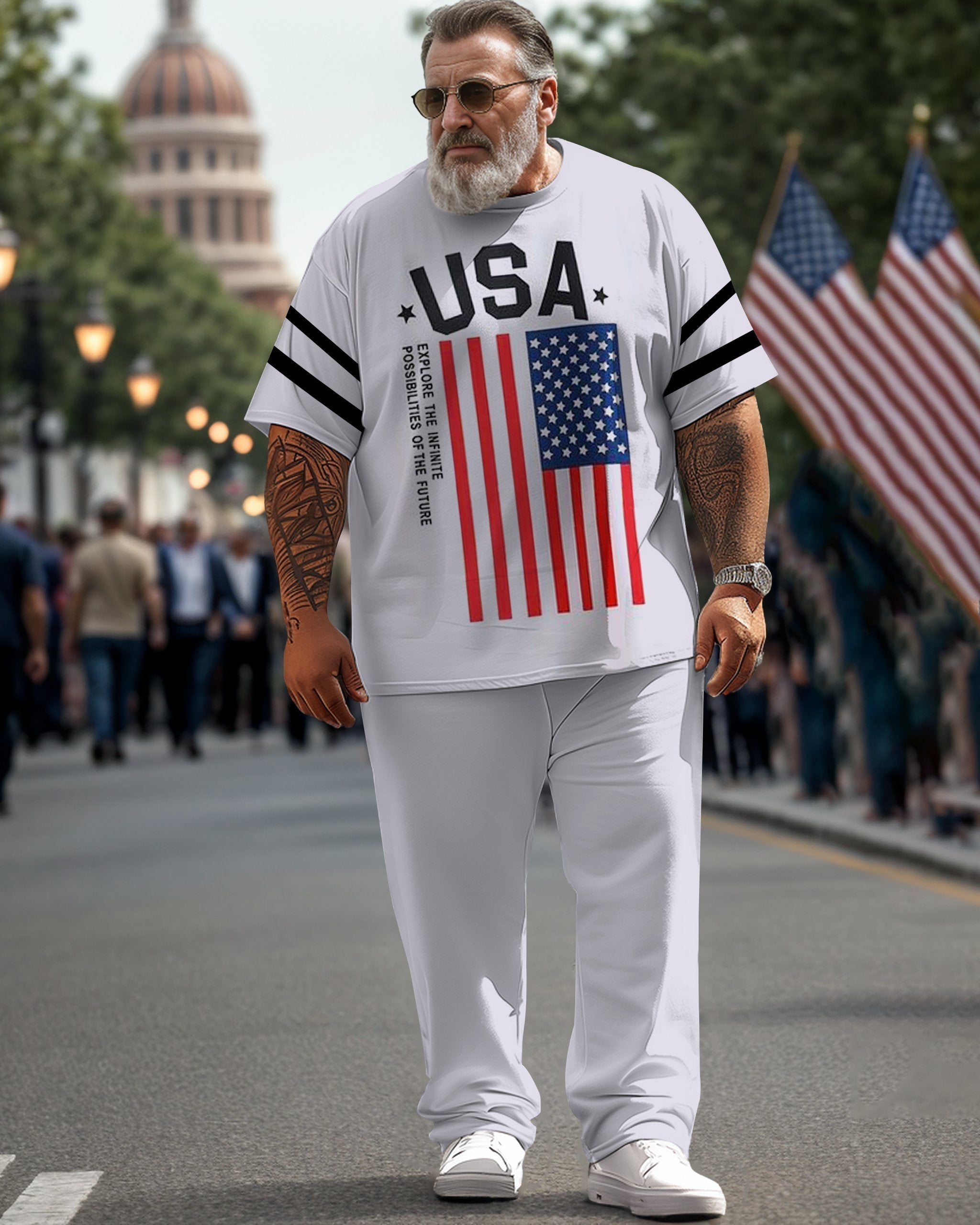 Men's large size street Independence Day short-sleeved T-shirt and trousers suit is suitable for Independence Day celebrations, street casual or parties and other occasions. This combination can show off one's fashion sense and love for Independence Day. Remember to choose the size and style that suits you to ensure the comfort and effect of the garment. According to personal preferences and the needs of the occasion, you can adjust the matching details appropriately to create a street style that suits your own style.