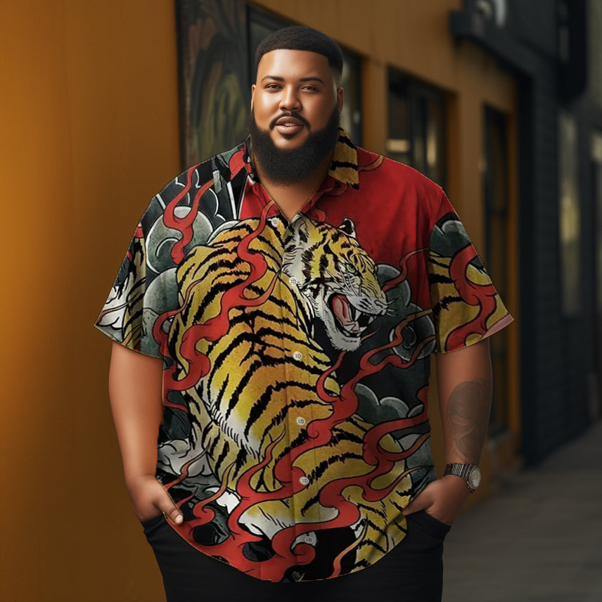 Tiger Graphic Prints Turndown Red  Printed  Casual Men's Plus Size Short Sleeve Shirt